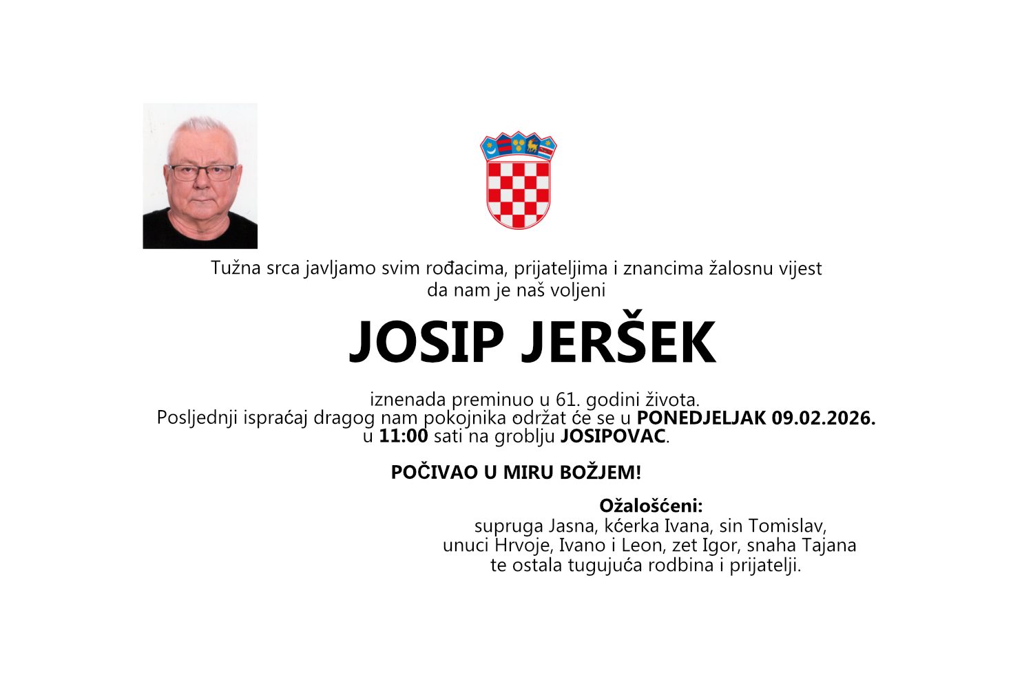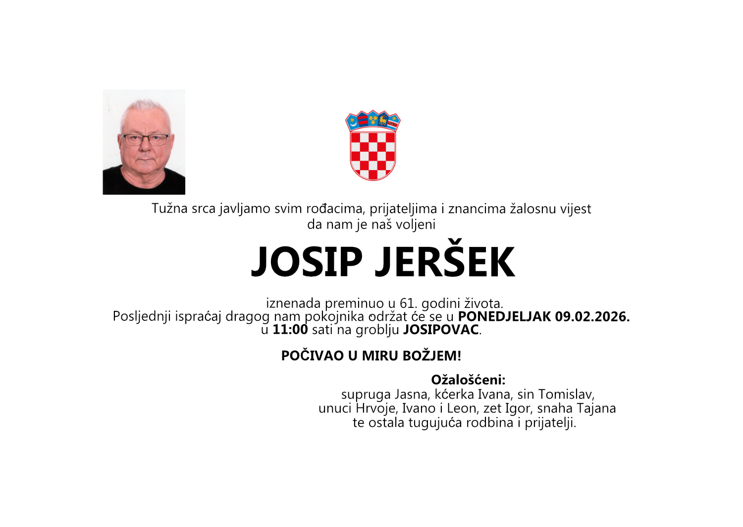 Josip Jeršek, ponedjeljak 09.02.2026. u 11:00 sati, groblje Josipovac