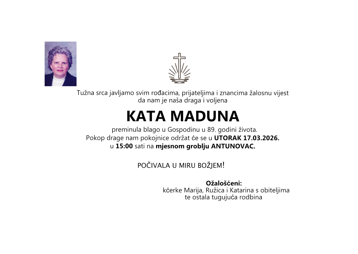 Kata Maduna, utorak 17.03.2026. u 15:00 sati, mjesno groblje Antunovac