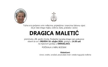 Dragica Maletić, srijeda 18.03.2026. u 14:30h, Okrugljača