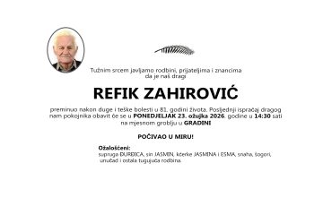 Refik Zahirović, ponedjeljak 23.03.2026.god. u 14:30 h, Gradina