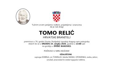 Tomo Relić, srijeda 25.03.2026.god. u 13:00 h. Špišić Bukovica