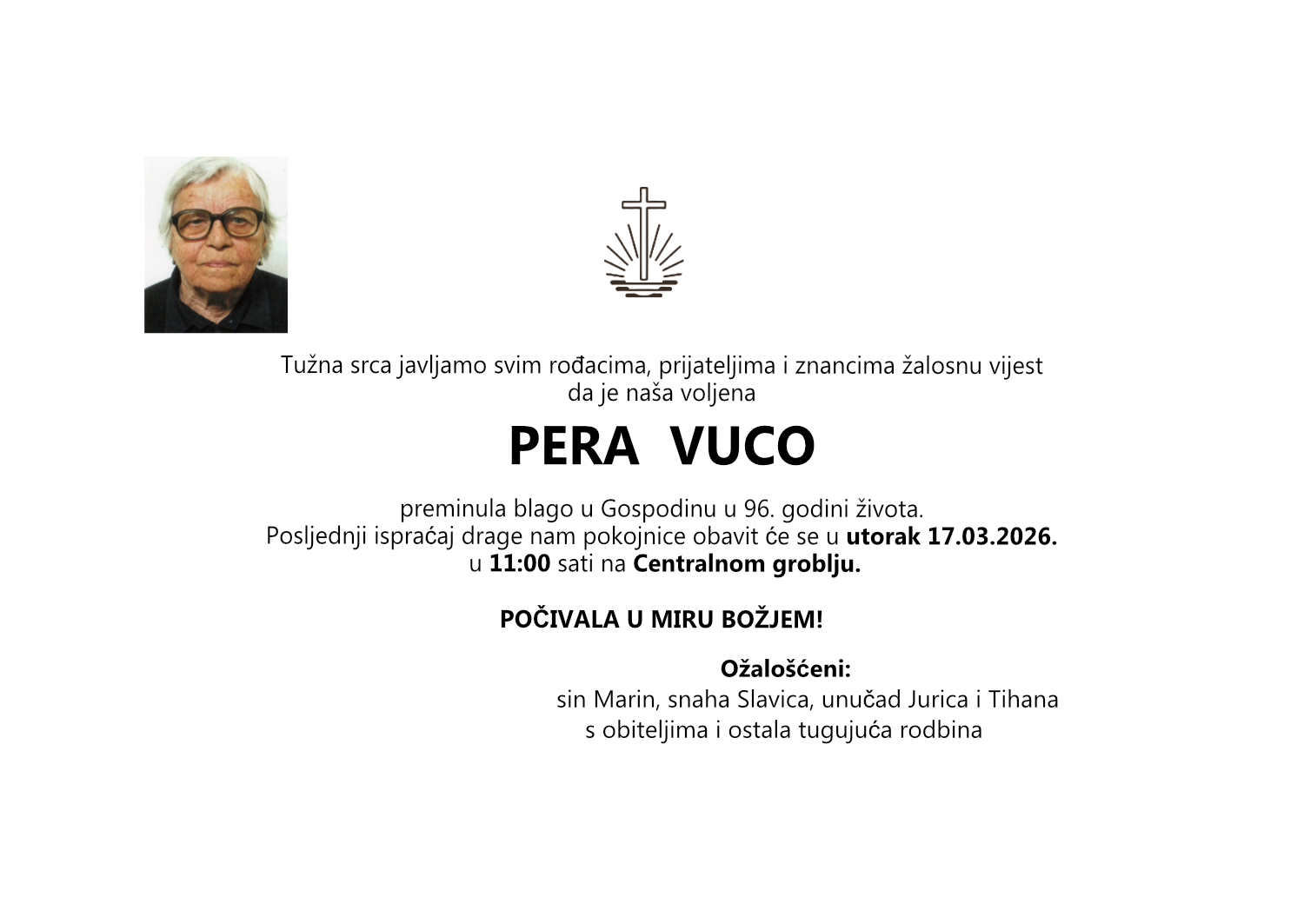 Pera Vuco, utorak 17.03.2026. u 11:00 sati, Centralno groblje, Osijek
